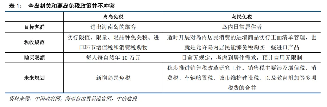 【2】岛民免税目前的品类预计和离岛免税有一定差异,且目前研究方案是将多种税收集合为销售税(类似日本、新加坡的消费税模式),因此在核心品类上也会与离岛免税有一定价格差距。在购物方式上,离岛免税对于进出海南客户依旧需要对消费资格和提货方式进行特殊规定,岛民免税虽然可能同样减免一些税费,但是考虑到防止走私串货等行径,必然会匹配相应的监管措施。游客和本地居民的需求将会逐渐分化对应不同政策。
