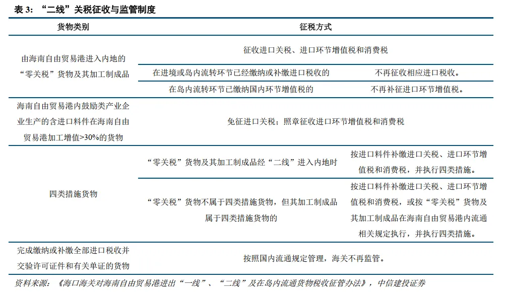根据海南自贸港有关政策规定,在“二线”将主要实施口岸海关监管与申报制度、出岛货物运输物流信息管理制度、关税征收与监管制度以及加工增值免关税等制度措施。封关后货物由海南自由贸易港进入内地的,应经由“二线口岸”通行并接受相应管理,采取双轨制管理模式:一种针对“零关税”货物及其加工制成品、享受加工增值免关税政策的保税货物、自境外进入海南自由贸易港时放宽贸易管理措施的货物及其加工制成品,除特殊情形外,应从海关监管通道通行,并接受海关监管,在岛内环节已经验核的,不再重复验核。另一种则针对其他国内流通货物,经非海关监管通道通行,由海南省按现行国内流通规定管理。