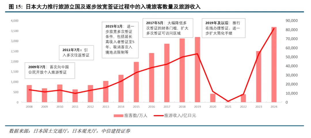 日本制定旅游立国战略后同步放宽赴日旅游签证及做好各类配套基础设施,其入境旅客数量从2012年的836万人次提升到2024年的3687万人次,年化增速13%;对应入境旅客贡献消费从1.32万亿日元提升到8.12万亿日元,年化增速16%,并且日本政府还设立了2030年实现入境旅游创收15万亿日元的目标。