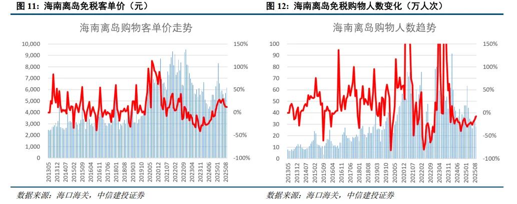 从海南的游客结构可以看出,2020年前国际旅客占海南岛1.7%,但旅游创收占到5%~6%,消费能力是平均的3~4倍。至2025年国际旅客占比在快速恢复中,在封关之后,国际旅客政策放宽将更加有利于这部分客群的增长;离岛免税对国际旅客放开后,也将激发其购买力。假设后续国际旅客数量达到5%占比,有望为目前离岛免税销售贡献15%~20%的销售增量。