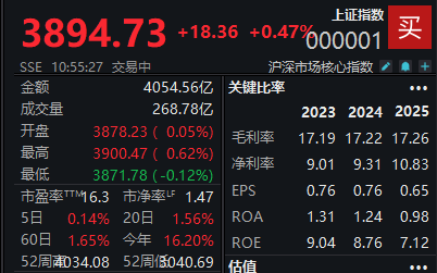 【大河财立方 记者 任浩鹏】大河财立方消息,12月19日,A股三大股指高开,随后指数震荡上涨,截至10:25发稿,上证指数涨0.49%,高点再触及3900点,深证成指涨1.12%,创业板指涨1.55%。全市场超过4400只个股上涨。