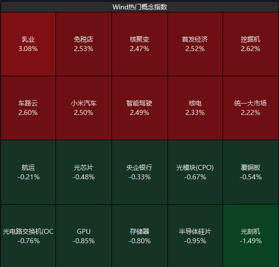 乳业板块方面,Wind乳业概念指数连续几日反弹上涨,庄园牧场三连板,骑士乳业、皇氏集团、品渥食品、熊猫乳品等涨幅居前。