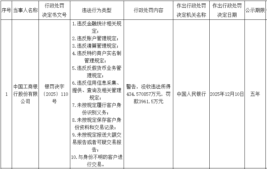 【大河财立方消息】12月19日,中国人民银行披露行政处罚决定书,因存在10项违法行为,中国工商银行被警告,没收违法所得434.570857万元,罚款3961.5万元,合计罚没约4396.07万元。17名责任人被同时追责。