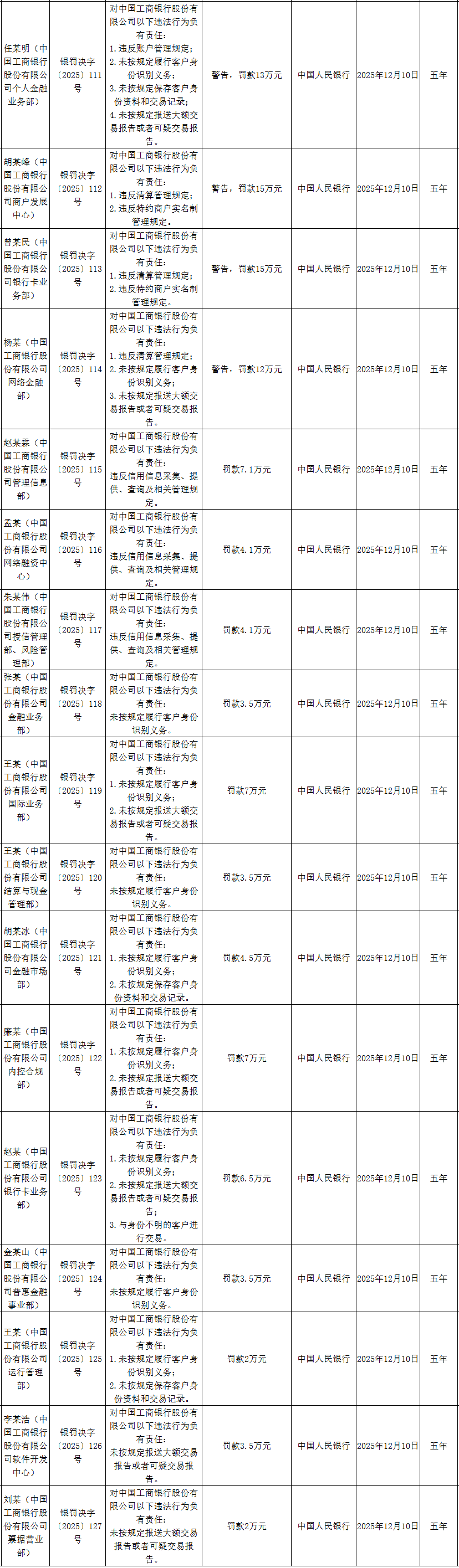 中国工商银行管理信息部赵某霖,网络融资中心孟某,授信管理部、风险管理部朱某伟,对违反信用信息采集、提供、查询及相关管理规定负有责任,分别被罚款7.1万元、4.1万元、4.1万元。