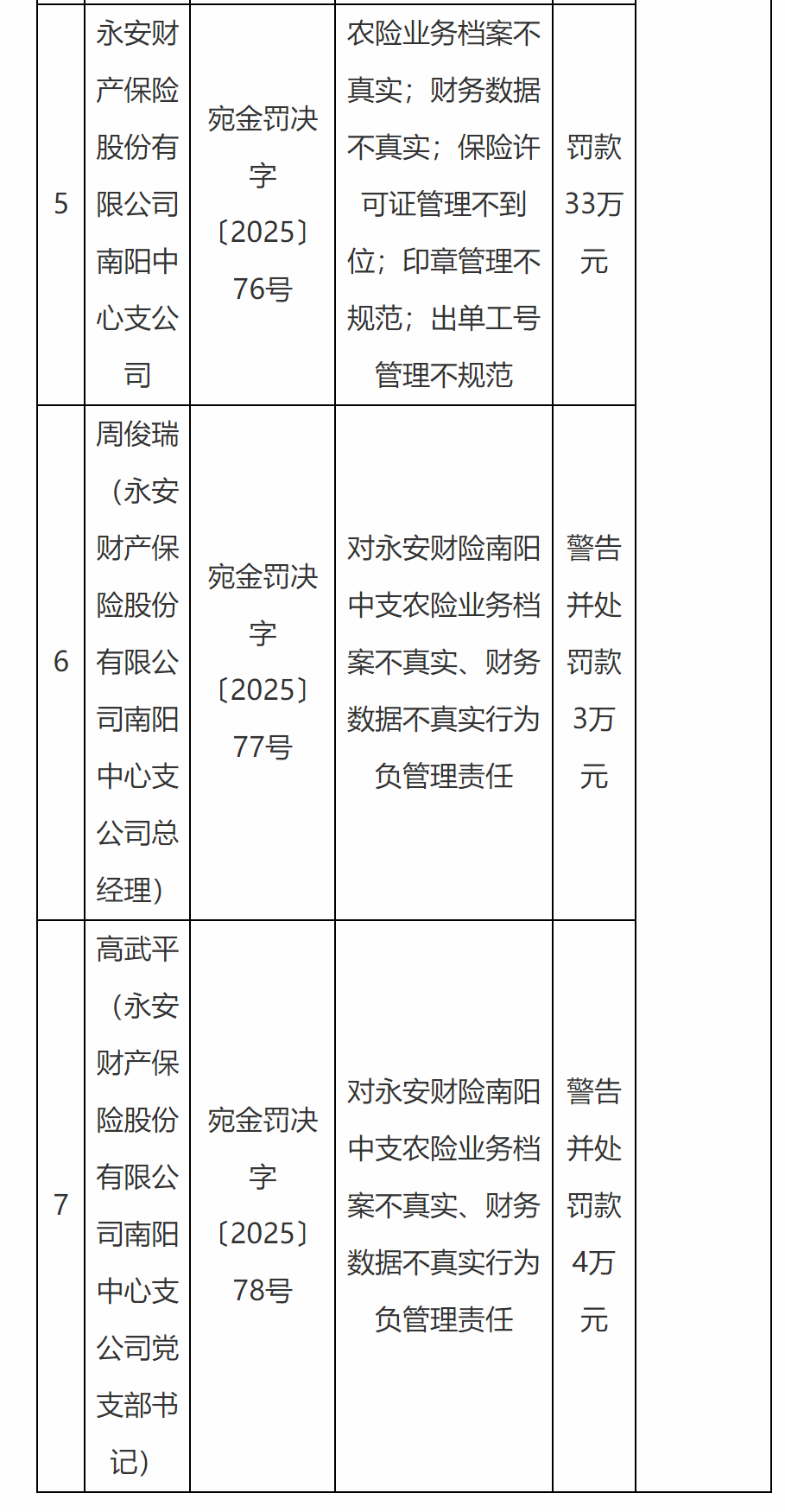 同时,南阳金融监管分局对永安财产保险股份有限公司南阳中心支公司总经理周俊瑞警告,并处罚款3万元;对永安财产保险股份有限公司南阳中心支公司党支部书记高武平警告,并处罚款4万元。