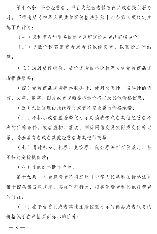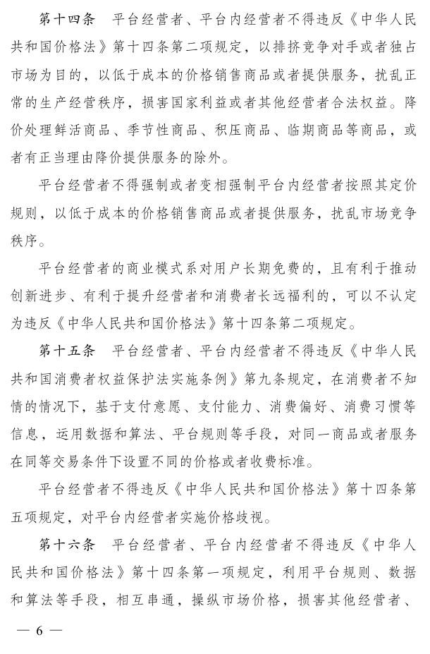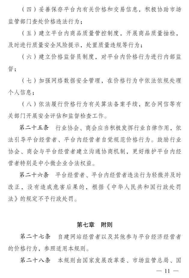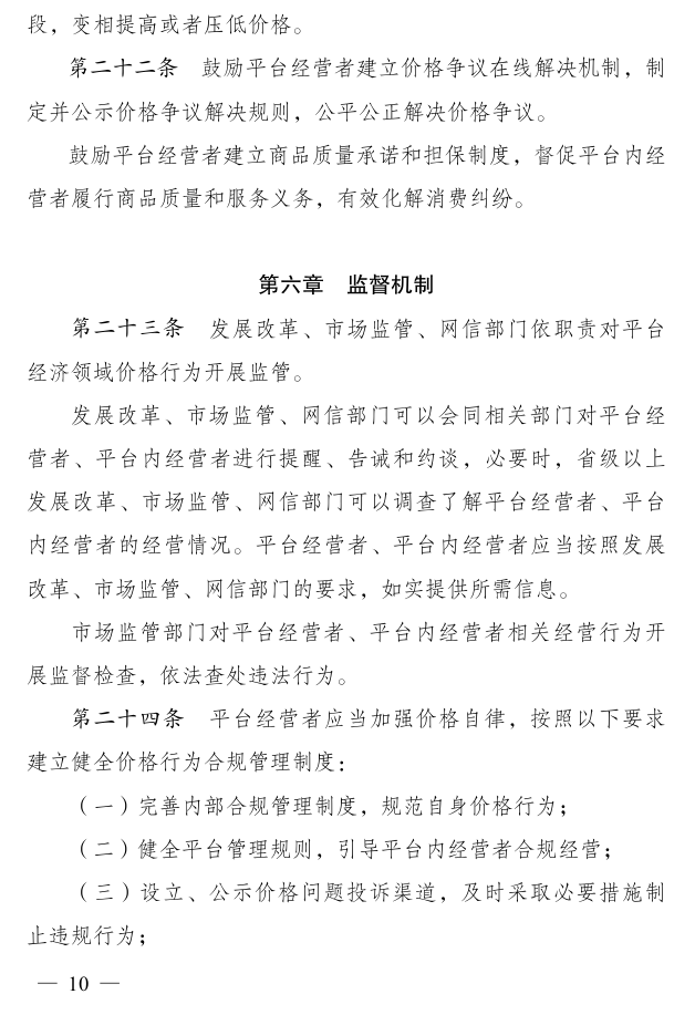 第六章监督机制4条,主要是明确发展改革、市场监管、网信部门监管职责和措施,要求平台经营者建立健全价格行为合规管理制度、行业协会商会充分发挥行业自律作用。