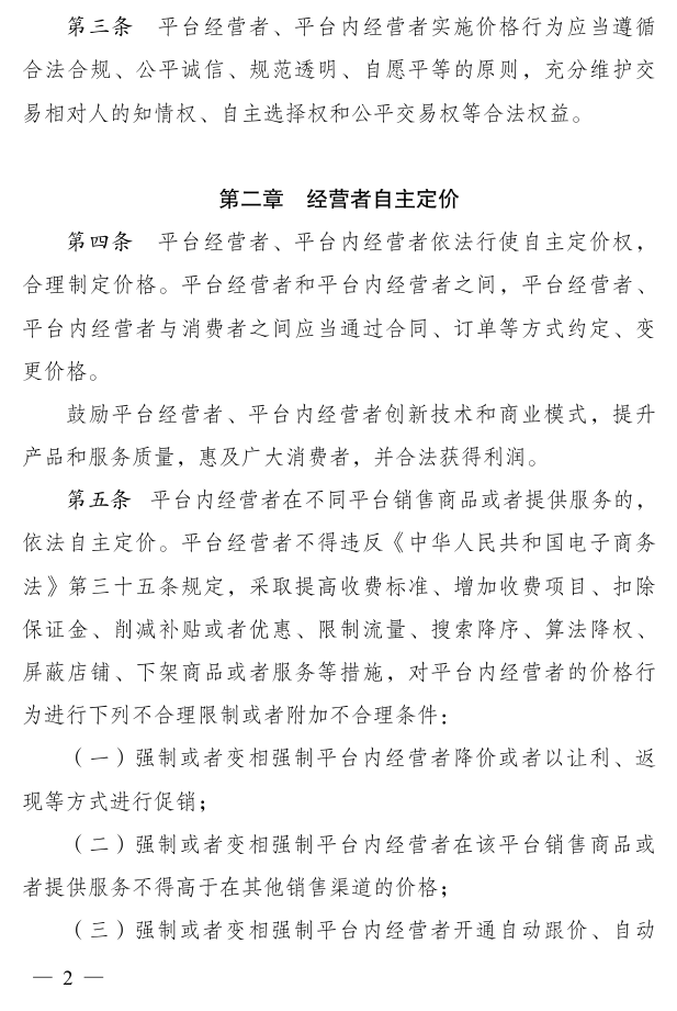第二章经营者自主定价3条,主要是聚焦保护经营者自主定价权,明确了经营者依法自主定价的基本要求,细化了保护平台内经营者自主定价权的监管规定,规范平台经营者收费行为。