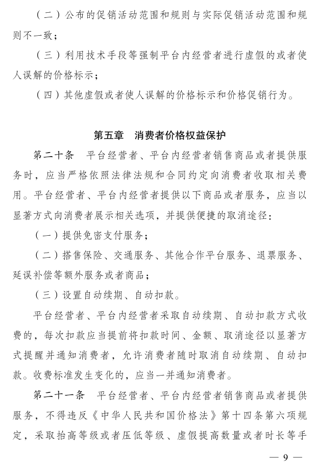 第五章消费者价格权益保护3条,主要是聚焦保护消费者知情权、自主选择权,规定经营者提供免密支付服务,搭售保险、交通等服务或者商品,设置自动续期、自动扣款,应当以显著方式向消费者展示相关选项,并提供便捷的取消途径。鼓励平台经营者建立价格争议在线解决机制、商品质量承诺和担保制度。