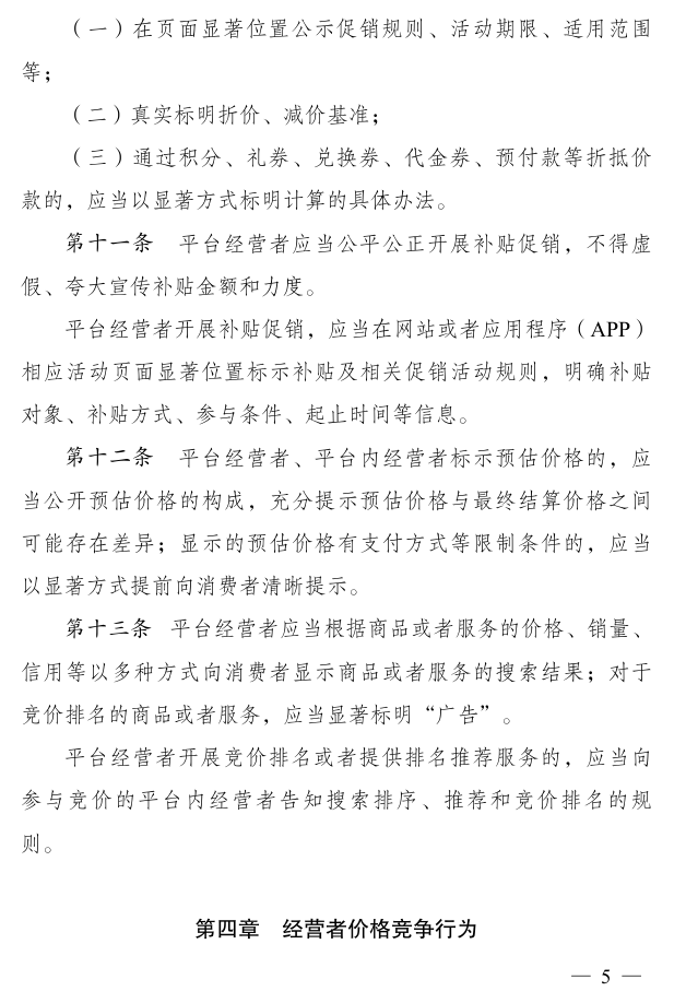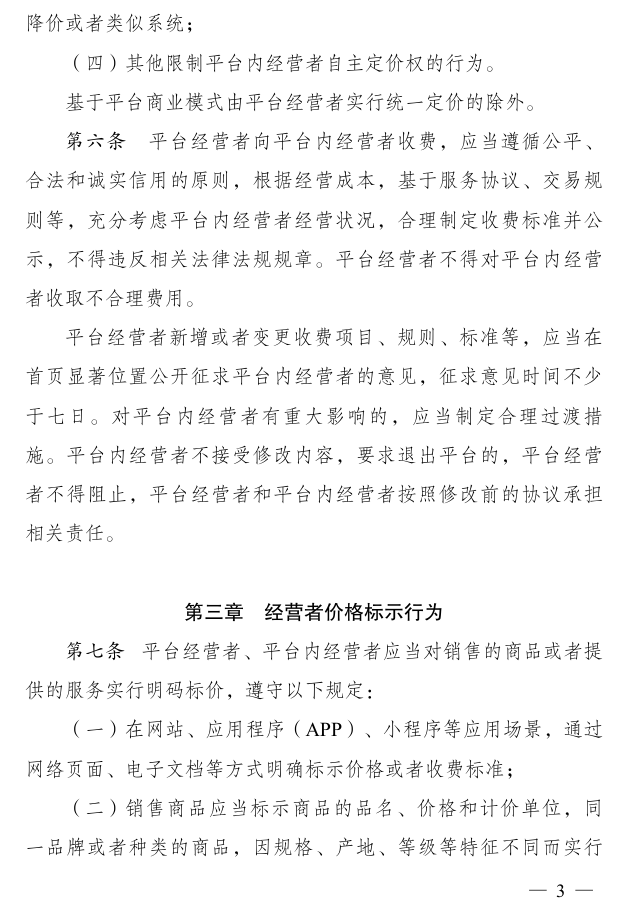 第三章经营者价格标示行为7条,主要是结合平台经济领域的具体场景和交易特点,细化平台经营者、平台内经营者明码标价的规定,要求公开差别定价、动态定价、竞价排名等规则,规范补贴促销行为。