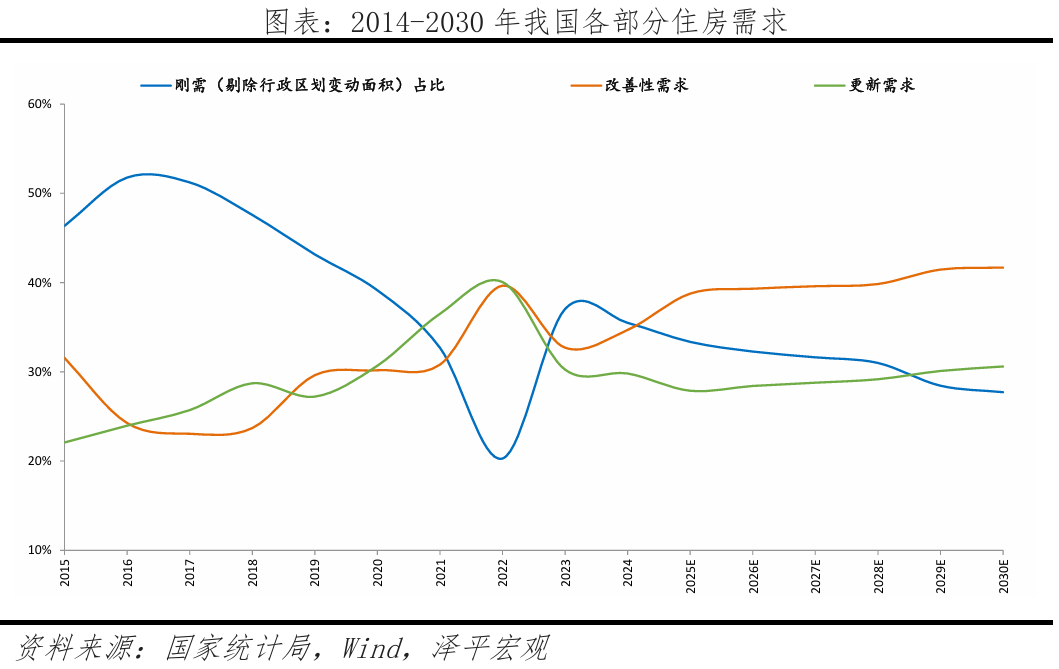 从供给看,中国城镇化进入稳定发展,城镇化速度放缓,根据我们测算,2025-2030年我国新增城镇常住人口约0.4亿人,城镇化率提升3.9个百分点,带来住房需求17.0亿平方米,年均2.8亿/年。城市发展从大规模增量扩张转向提质增效,城市更新成为新动能,“十四五”规划提出,要完成约21.9万个城镇老旧小区改造任务,据测算,2025-2030年,我国城市更新带来住房需求约16.1亿平,年均约2.7亿平/年。城中村改造、老旧小区更新、低效用地盘活将为住房供给提供新的空间,政策层面明确住房供给“严控增量、优化存量、提高质量”,减少土地供应,重点发展建设安全、舒适、绿色、智慧的“好房子”,使之与当前的实际需求匹配。