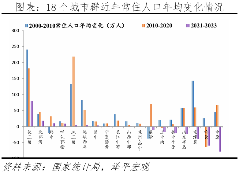 分城市群看,2010-2020年珠三角、长三角城市群年均常住人口增量超180万人,但东北、西部等区域近年面临产业结构单一,呈现人口流出趋势,2021-2023年长三角人口进一步集聚,年均常住人口增量达80万人,位居第一,高于第2至第7位的城市群年均常住人口增量之和。