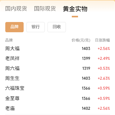 部分黄金饰品品牌价格同步上涨,周大福、周生生、老庙等品牌黄金饰品价格已超过1400元/克,老凤祥、六福珠宝等也已逼近这一价格。