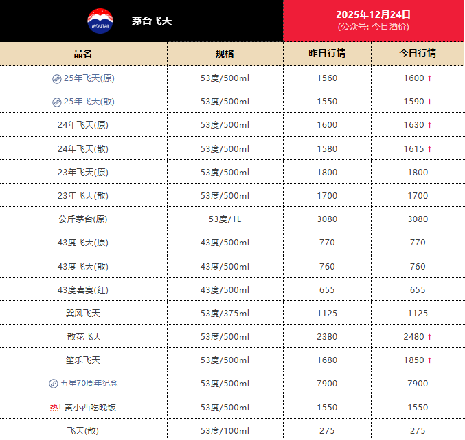 【大河财立方消息】12月24日,“今日酒价”披露的最新批发参考价显示,25年飞天茅台原箱报1600元/瓶,较上一日涨40元;25年飞天茅台散瓶报1590元/瓶,较上一日涨40元。24年飞天茅台原箱报1630元/瓶,较上一日涨30元;24年飞天茅台散瓶报1615元/瓶,较上一日涨35元。