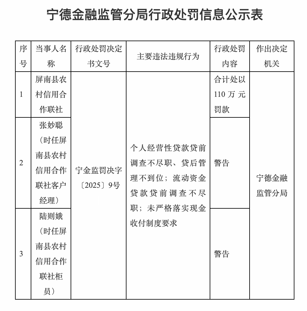 因个人经营性贷款贷前调查不尽职、贷后管理不到位;流动资金贷款贷前调查不尽职;未严格落实现金收付制度要求,屏南县农村信用合作联社被罚款110万元。时任该信用社客户经理张妙聪和时任该信用社柜员陆则娥被警告。
