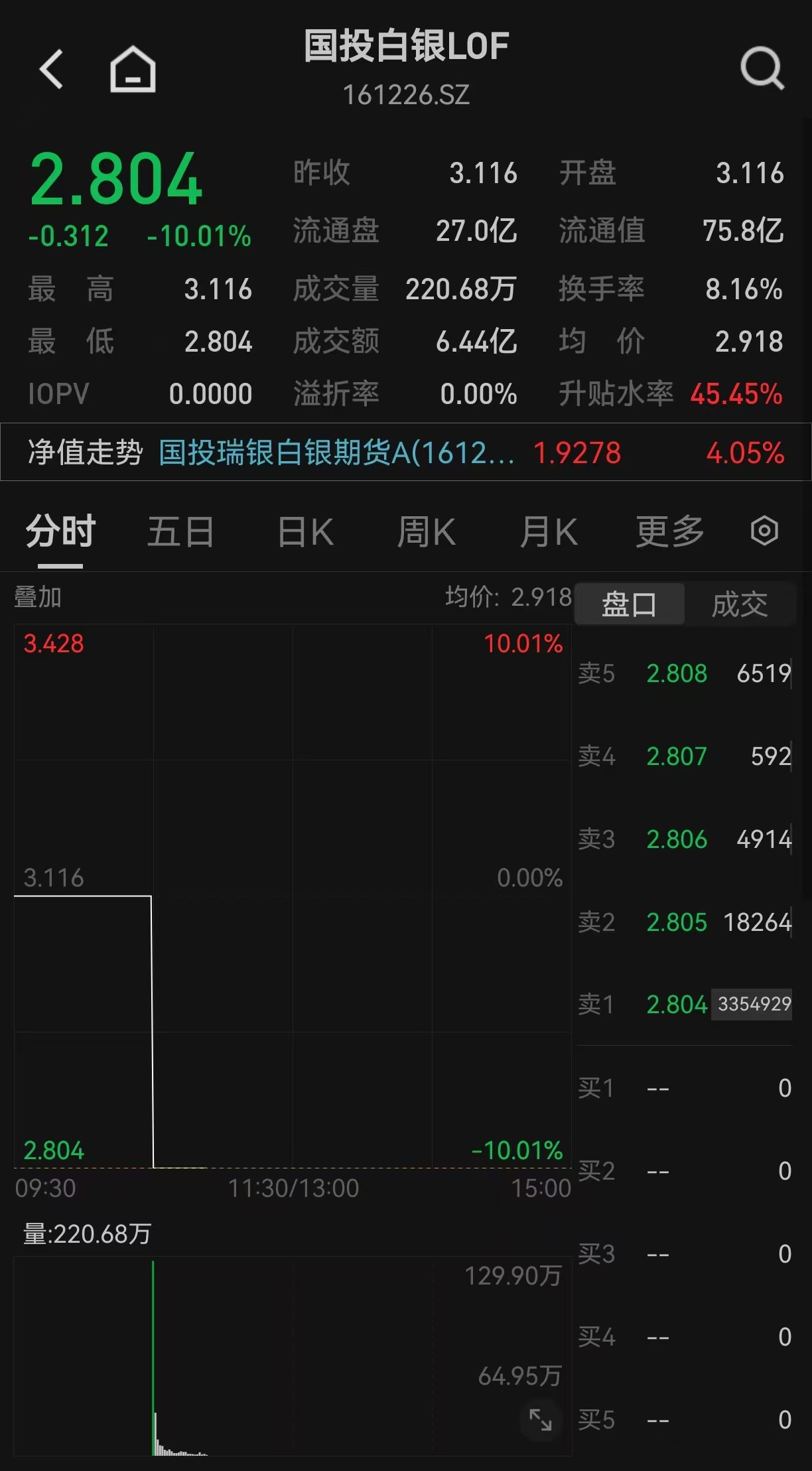 【大河财立方消息】12月25日,国投白银LOF(161226.SZ)今日复牌封跌停,封单金额超8亿元,溢价率收窄至45%,另外国投瑞盈LOF(161225.SZ)、国泰商品LOF(160216.SZ)均封死跌停。