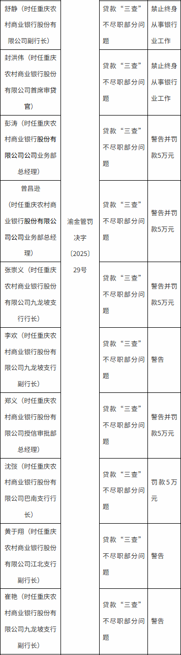 其中,时任该行副行长舒静、时任该行首席审贷官封洪伟二人被禁止终身从事银行业工作;时任该行公司业务部总经理彭涛、曾昌逊,时任该行九龙坡支行行长张崇义,时任该行授信审批部总经理郑义,均被警告并罚款5万元;