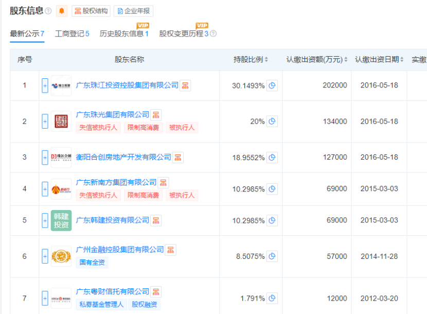此外,在其主要股东里面,广东珠光集团有限公司(持股20%)、广东新南方集团有限公司(持有10.29%)均被列入失信被执行人、限制高消费。