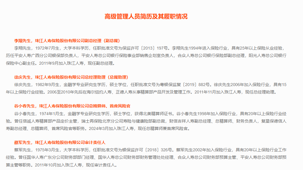 大河财立方记者梳理发现,截至目前,珠江人寿官网披露的高管团队仅有4人,包括副总经理李翔、总经理助理徐庆、审计责任人蔡军以及2024年加入的总精算师兼首席风险官谷小春。其中,除谷小春外,其余多为公司成立初期即加入的“元老级”高管。
