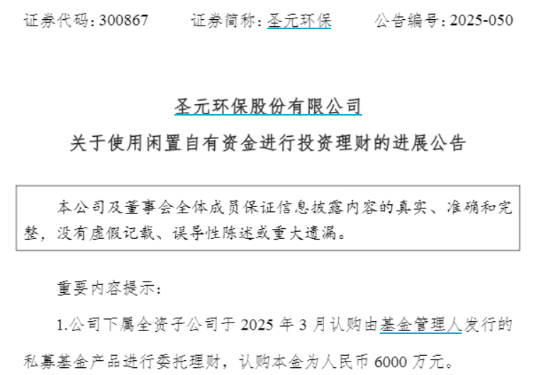 【大河财立方消息】原是为提高资金使用效率、谋求更佳投资回报而配置的私募基金产品,在持有将近9个月后,却发现已亏损近4700万。在认定基金管理人及托管人存在违规后,圣元环保股份有限公司(证券简称:圣元环保)果断选择报警。