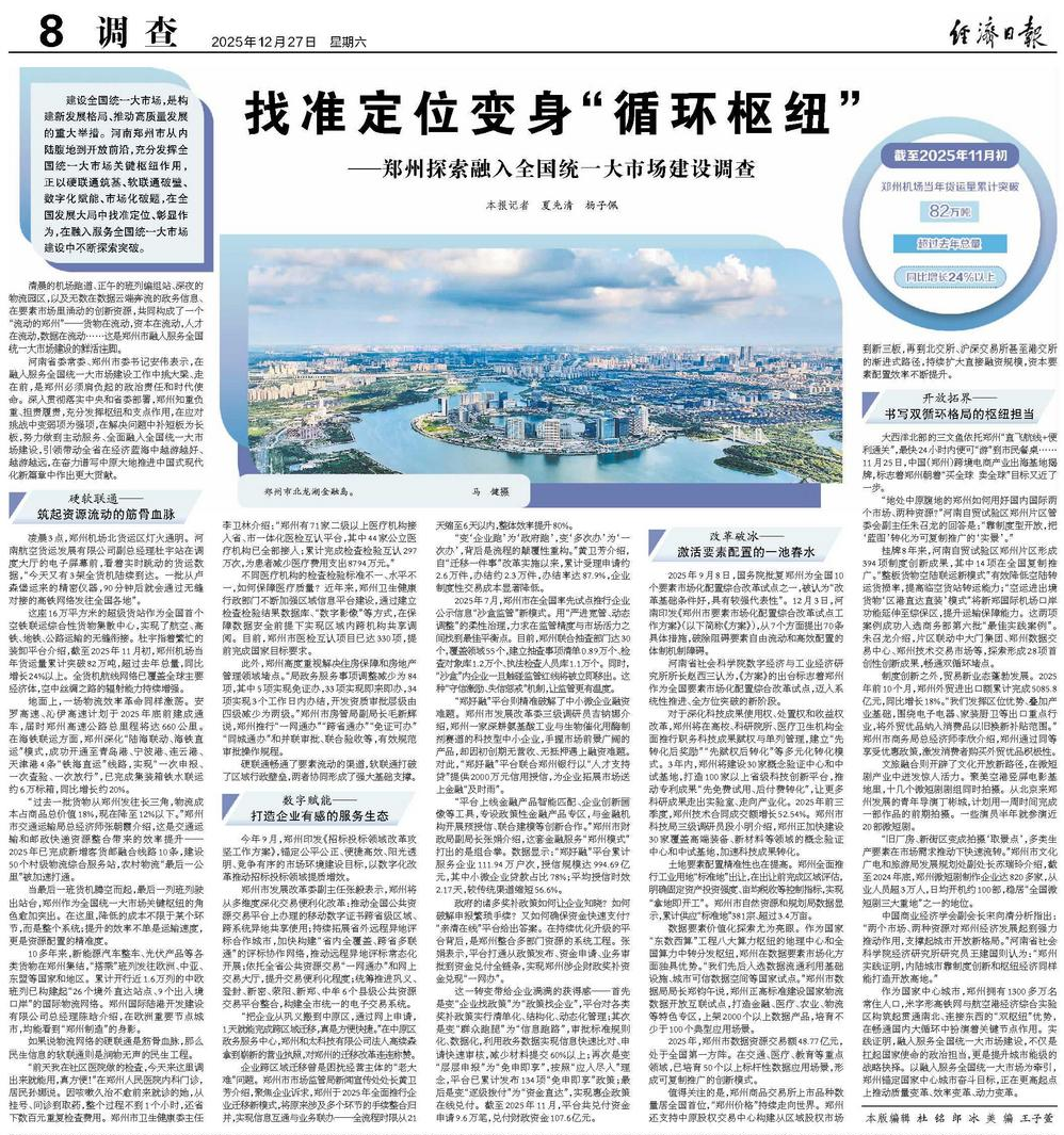 作为国家中心城市,郑州拥有1300多万名常住人口,米字形高铁网与航空港经济综合实验区构筑起贯通南北、连接东西的“双枢纽”优势,在畅通国内大循环中扮演着关键节点作用。实践证明,融入服务全国统一大市场建设,不仅是扛起国家使命的政治担当,更是提升城市能级的战略抉择。以融入服务全国统一大市场为牵引,郑州锚定国家中心城市奋斗目标,正在更高起点上推动质量变革、效率变革、动力变革。(记者 夏先清 杨子佩)