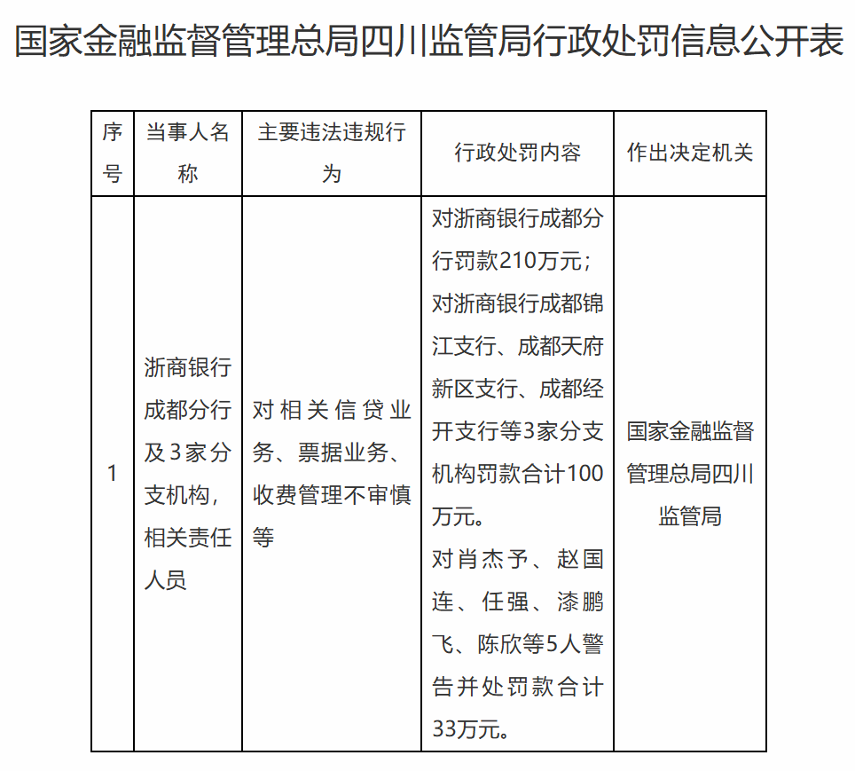 【大河财立方消息】12月27日消息,国家金融监督管理总局四川监管局日前披露的行政处罚信息公开表显示,因对相关信贷业务、票据业务、收费管理不审慎等,浙商银行成都分行被罚210万元;浙商银行成都锦江支行、成都天府新区支行、成都经开支行等3家分支机构合计被罚100万元。