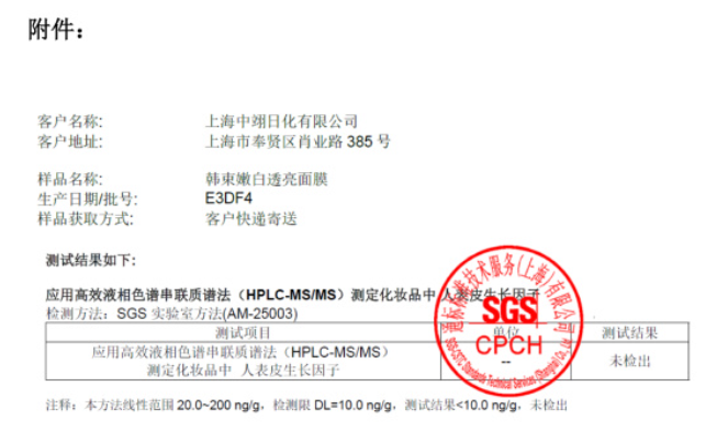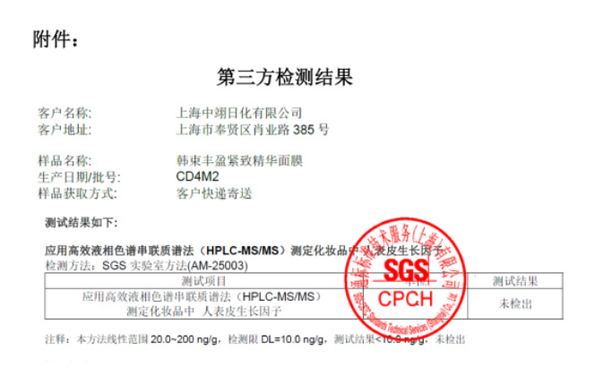 此前,央视财经《经济半小时》报道,在韩束丰盈紧致精华面膜和韩束嫩白透亮面膜中,分别检测出0.07pg/g和3.21pg/g的表皮生长因子。