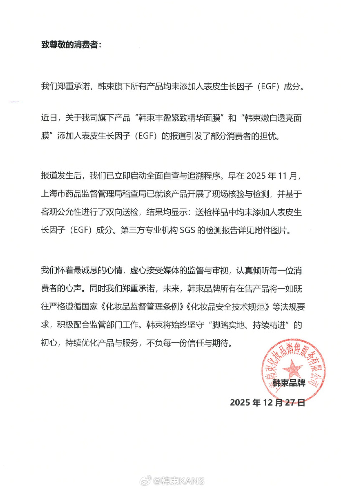 【大河财立方消息】12月27日,韩束官方微博发文称,韩束旗下所有产品均未添加人表皮生长因子(EGF)成分。