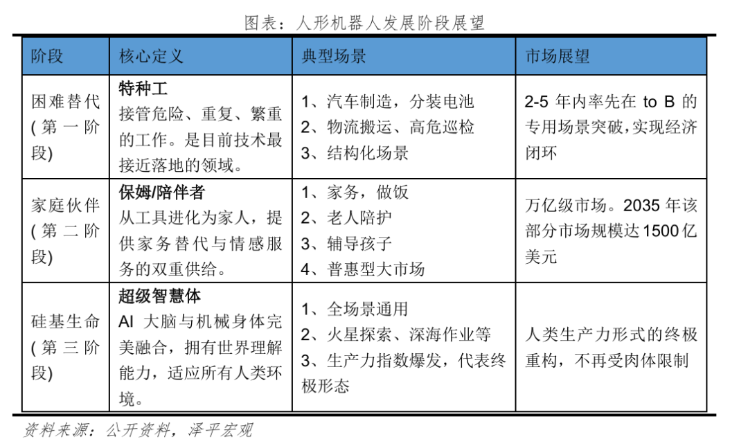 人形机器人就是给了AI一个物理“身体”,服务于人类社会。人形机器人的发展将经历三个阶段: