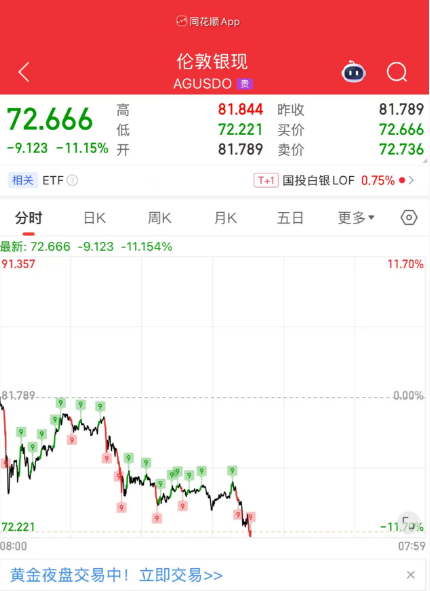 今天,现货白银一这个市场最炙手可热的品种,已从盘中最高价格的84.0美元下跌11.4美元,即13.5%