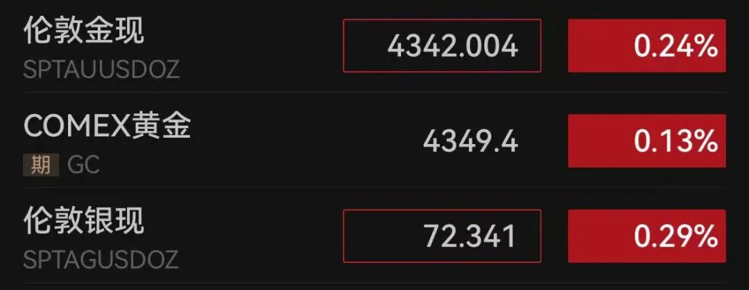 截至12月30日7时52分,现货白银报72.341美元/盎司,微涨0.29%,现货黄金报4342.004美元/盎司,微涨0.24%。