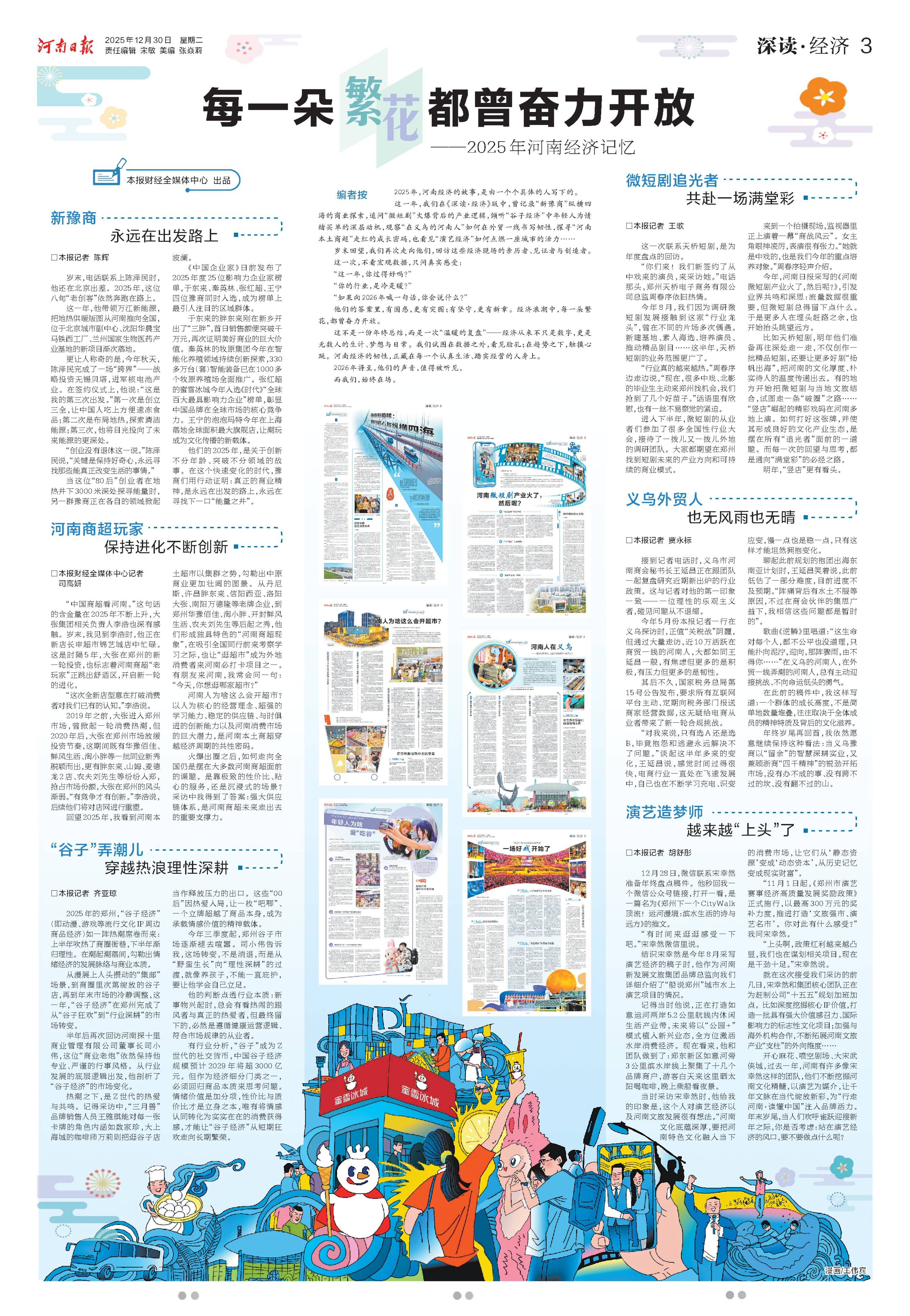 这一年,我们在《深读·经济》版中,曾记录“新豫商”纵横四海的商业探索,追问“微短剧”火爆背后的产业逻辑,倾听“谷子经济”中年轻人为情绪买单的深层动机,观察“在义乌的河南人”如何在外贸一线书写韧性,探寻“河南本土商超”走红的成长密码,也看见“演艺经济”如何点燃一座城市的活力……