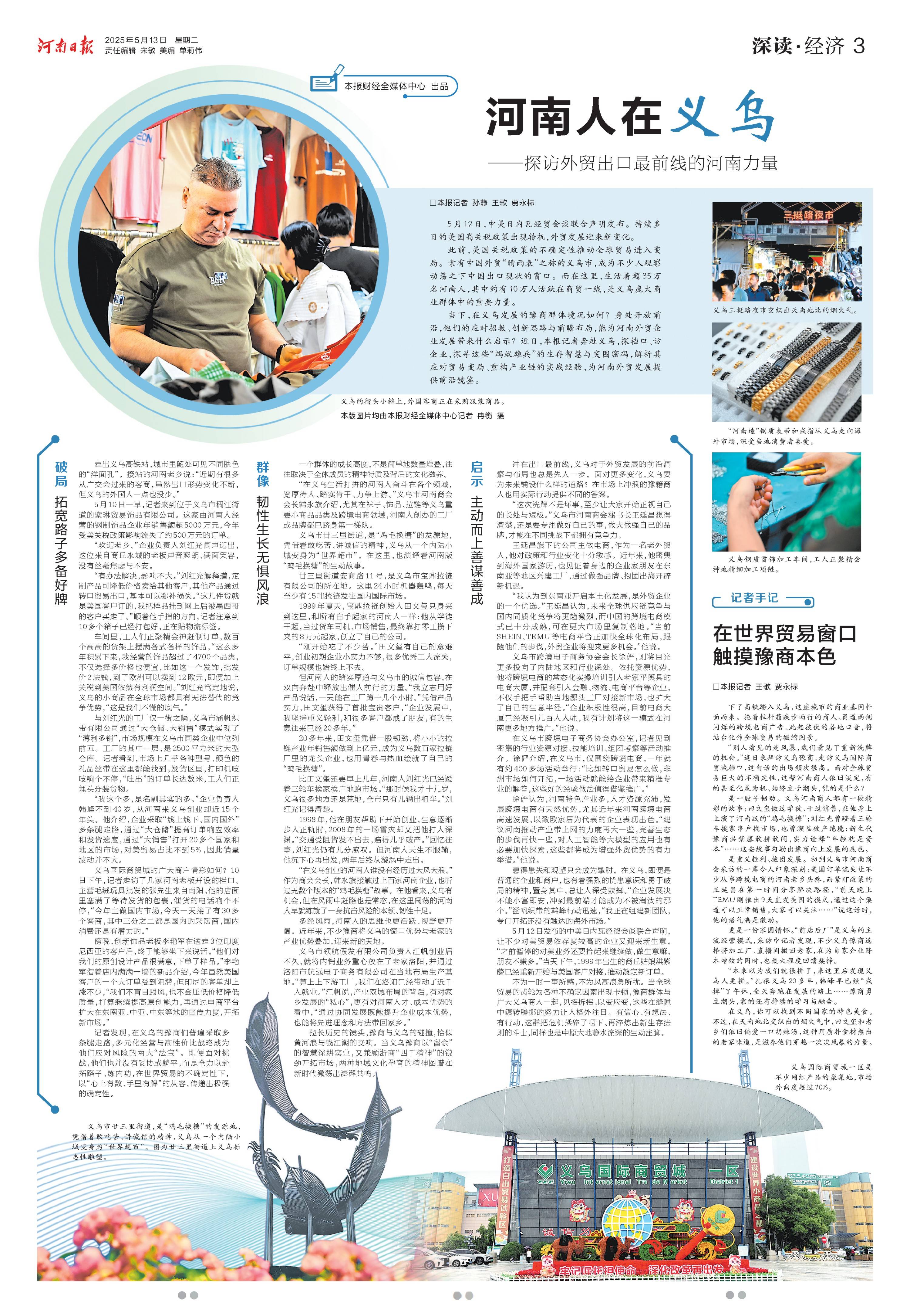 今年5月份本报记者一行在义乌探访时,正值“关税战”阴霾,但通过大量走访,近10万活跃在商贸一线的河南人,大都如同王延昌一般,有焦虑但更多的是积极,有压力但更多的是韧性。