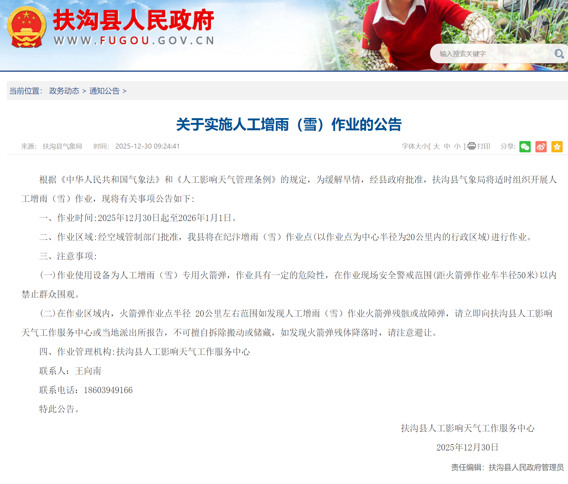 扶沟县人工影响天气工作服务中心发布关于实施人工增雨(雪)作业的公告,2025年12月30日起至2026年1月1日,经空域管制部门批准,扶沟县将在纪汴增雨(雪)作业点(以作业点为中心半径为20公里内的行政区域)进行作业。