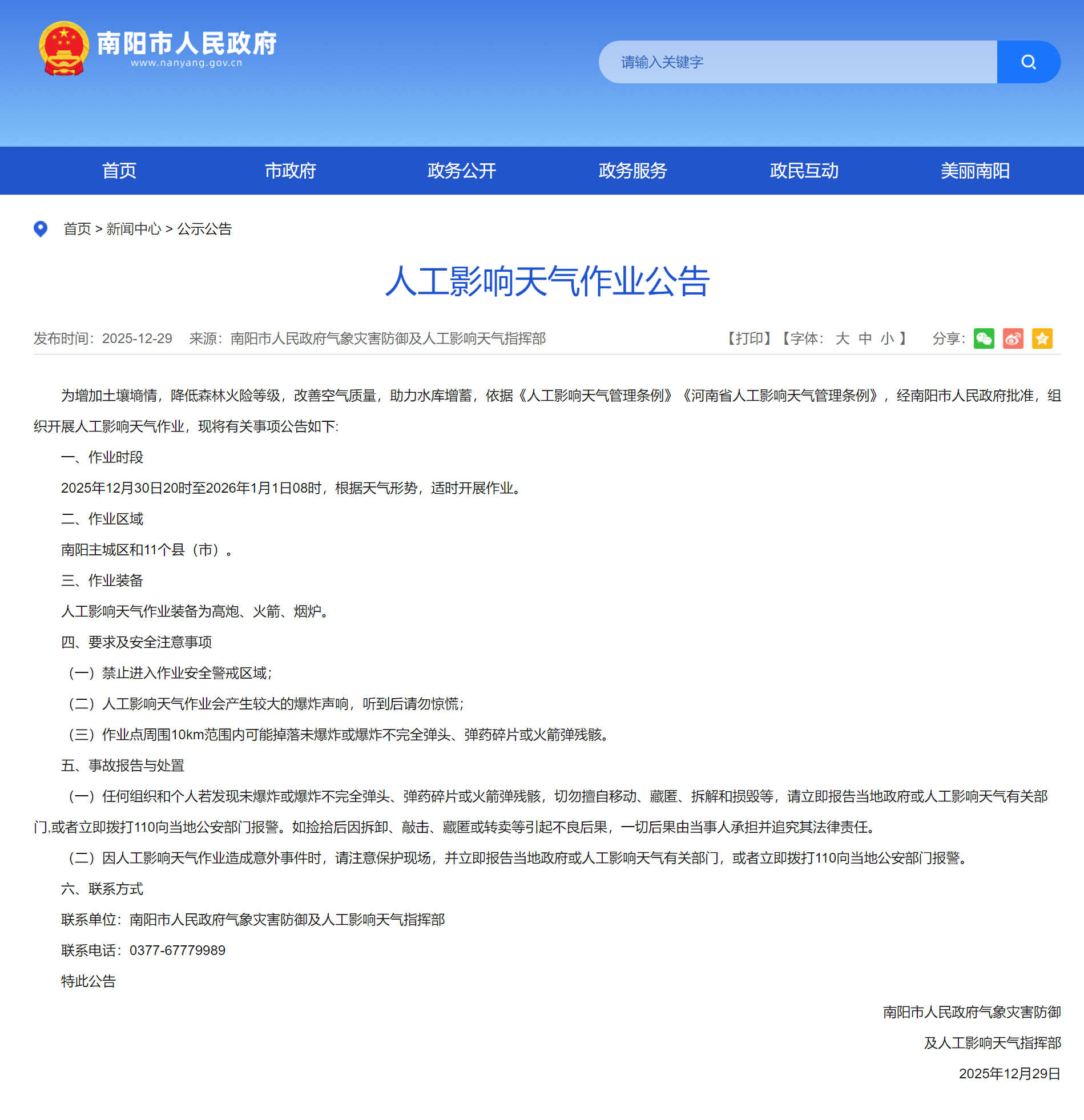 12月30日消息,南阳市人民政府气象灾害防御及人工影响天气指挥部发布人工影响天气作业公告,2025年12月30日20时至2026年1月1日8时,根据天气形势,适时开展作业,作业区域为南阳主城区和11个县(市)。