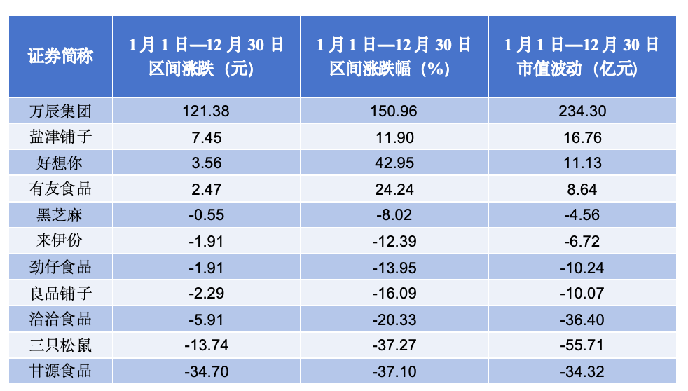 从股价涨跌幅来看,万辰集团以150.96%的累计涨幅表现最为突出;好想你、有友食品、盐津铺子亦表现较好,年内涨幅分别为42.95%、24.24%和11.90%。