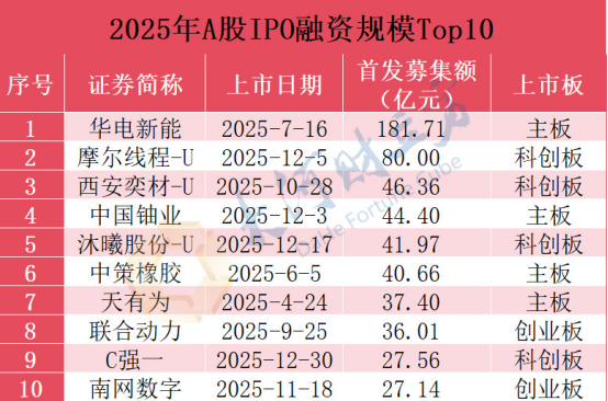 记者注意到,年内A股IPO前十中,出现多只“第一股”。如“国产GPU第一股”摩尔线程,首发融资80亿元,位居全年第二;“铀业第一股”中国铀业,首发融资44.4亿元,位居全年第四;“科八条”后首家过会的未盈利企业——西安奕材,首发融资46.36亿元,位居全年第三。