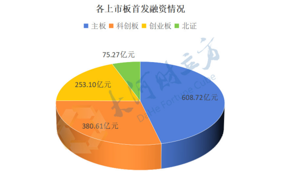 从上市板块来看,沪深主板融资规模608.72亿元,占比近半;科创板融资规模超过创业板,达380.61亿元;创业板融资规模253.10亿元,北交所融资规模75.27亿元。