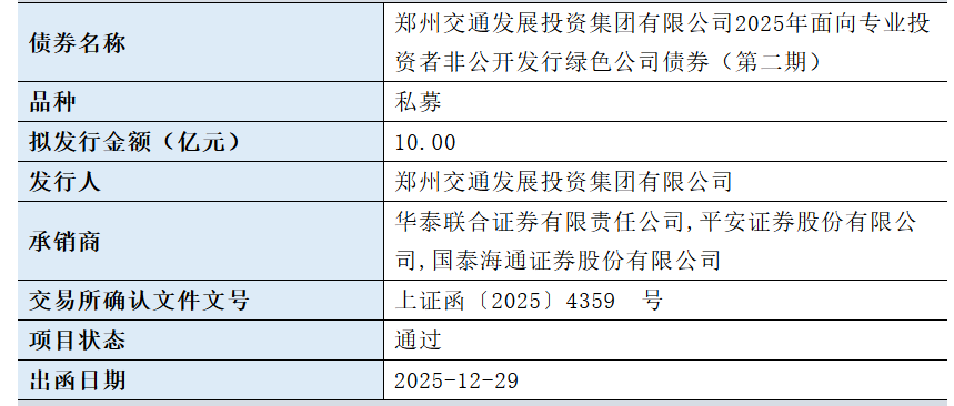 【大河财立方消息】12月31日,郑州交通发展投资集团有限公司2025年面向专业投资者非公开发行绿色公司债券(第二期)获上交所通过。该债券拟发行金额10亿元,承销商为华泰联合证券、平安证券和国泰海通证券。2025年7月18日,经中诚信国际综合评定,发行人主体信用评级为AAA,展望稳定。