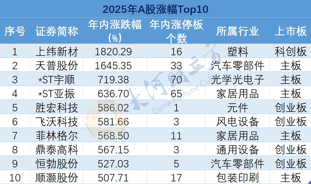 【大河财立方 见习记者 金怡杉】2025年12月31日,A股正式收官。这一年,近八成个股(4230只股票)实现全年上涨;沪指累计上涨18.41%,2921只个股跑赢大盘;540只个股股价翻倍;10只大牛股涨幅超500%,成为投资者眼中的“造富机器”。