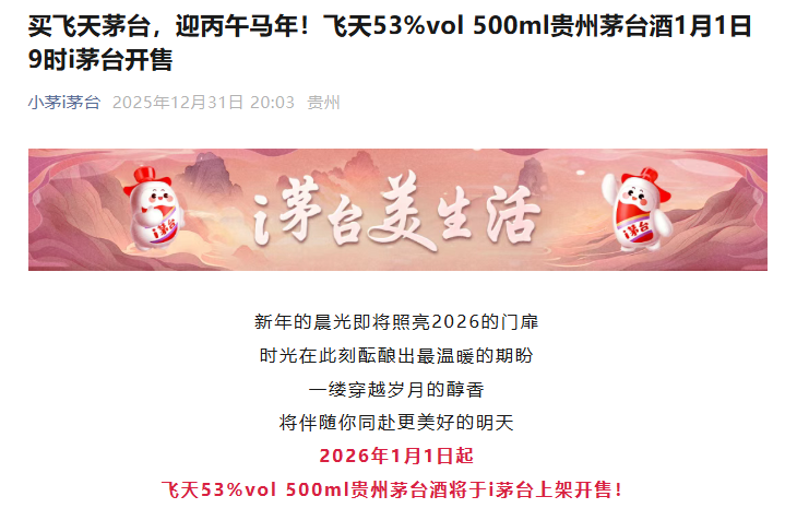 【大河财立方消息】12月31日晚间,贵州茅台“小茅i茅台”发布消息称,2026年1月1日起,飞天53%vol 500ml贵州茅台酒将于i茅台上架开售,每人每天可以购买12瓶。