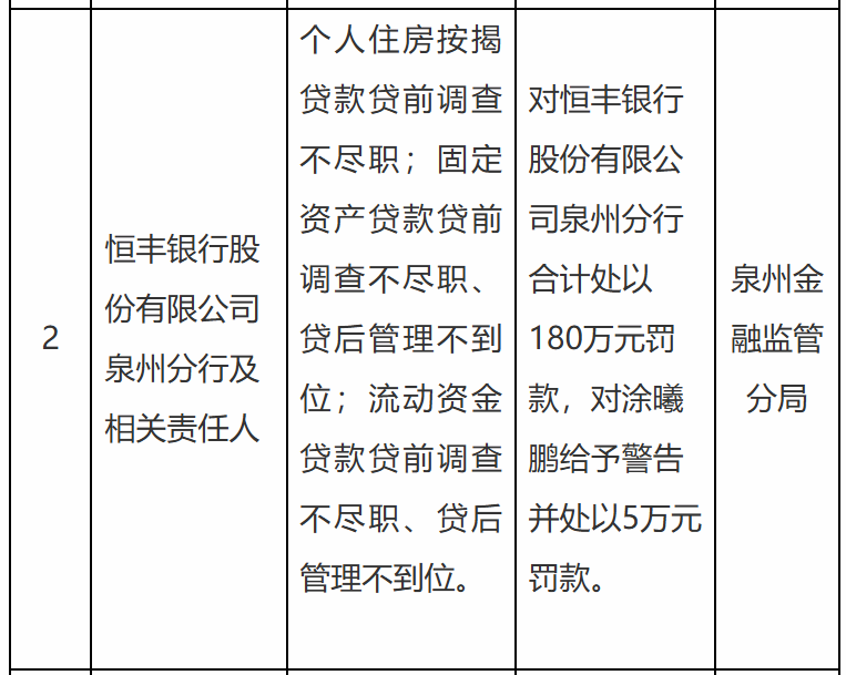 【大河财立方消息】12月31日消息,泉州金融监管分局行政处罚信息公示表显示,恒丰银行股份有限公司泉州分行被罚180万元。