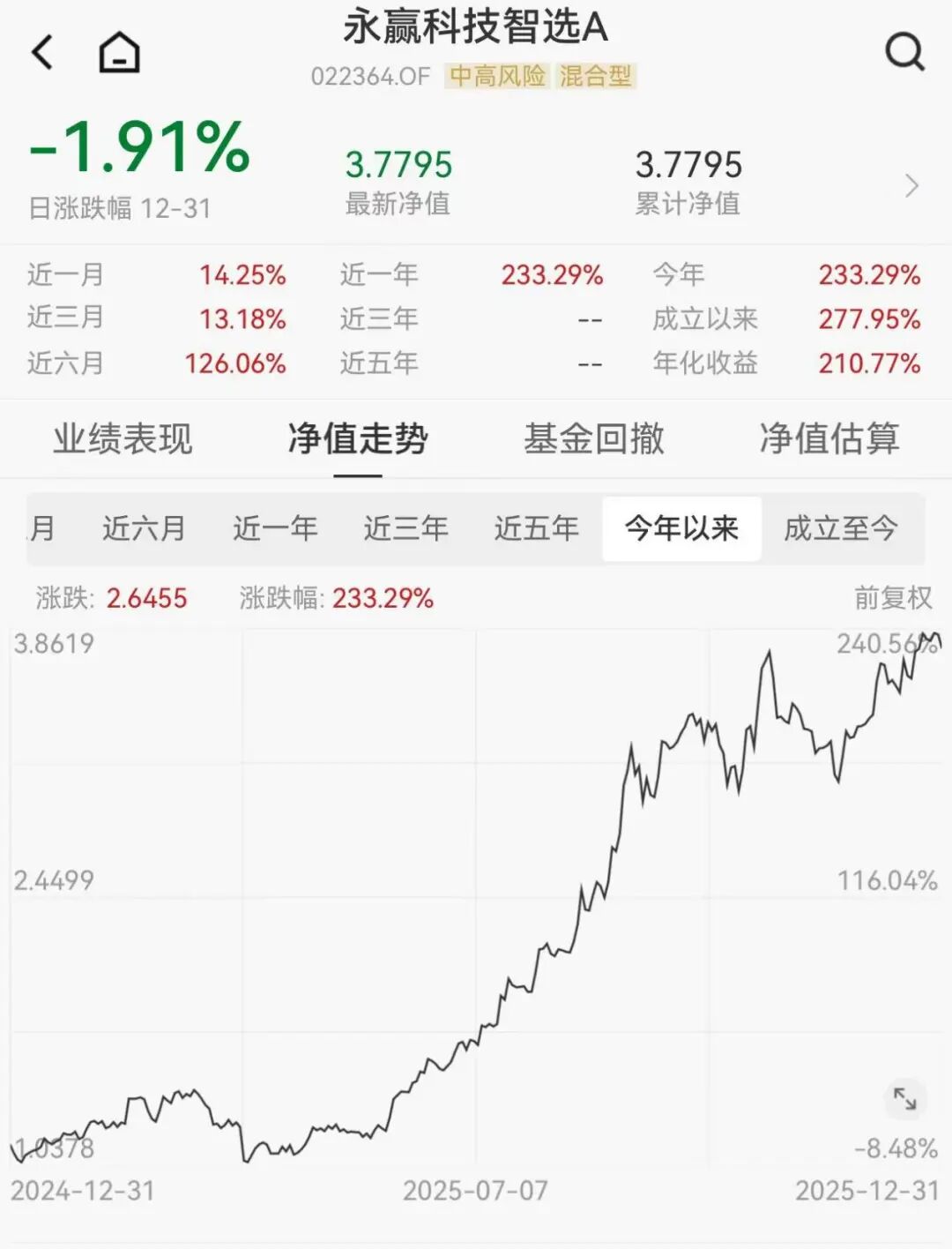 其中,由任桀管理的永赢科技智选取得233.29%的单位净值增长率,不仅在主动权益基金业绩榜单上名列第一,更是摘得2025年度公募基金全市场冠军,且领先优势明显。更值得关注的是,这一成绩刷新了由王亚伟管理的华夏大盘精选混合A保持了17年的公募年度收益纪录(226.24%),创下新的历史标杆。