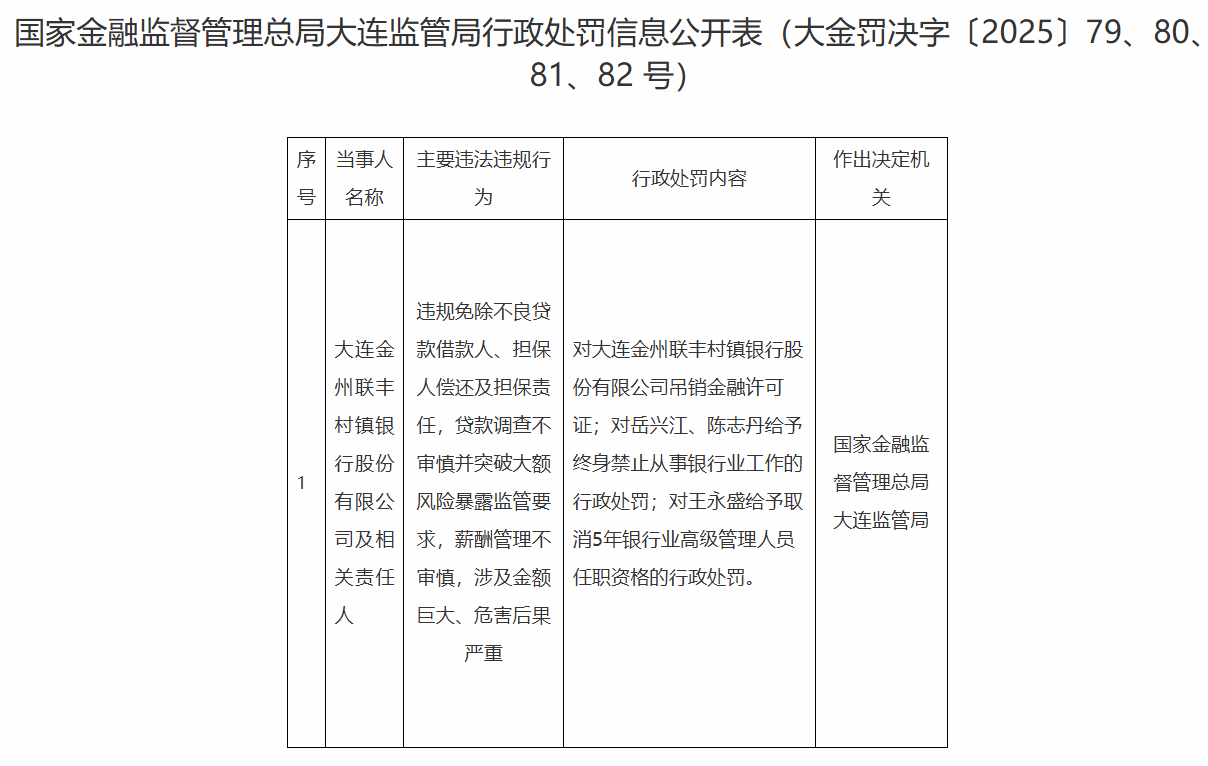国家金融监督管理总局大连监管局对相关责任人岳兴江、陈志丹给予终身禁止从事银行业工作的行政处罚;对王永盛给予取消5年银行业高级管理人员任职资格的行政处罚。