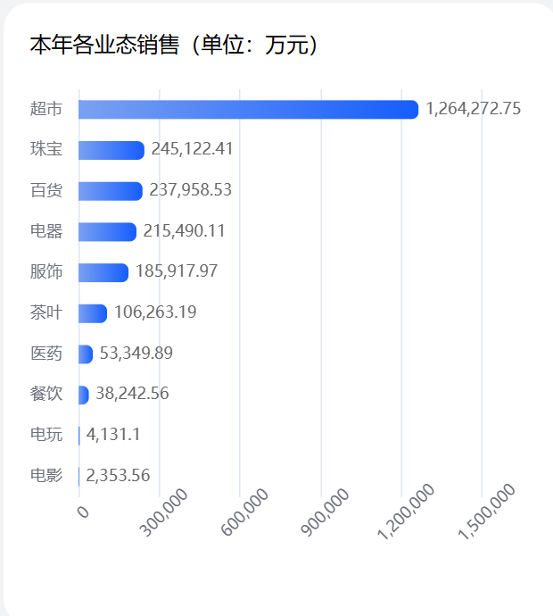 各业态销售数据显示,超市销售额达126.43亿元,珠宝销售额达24.51亿元,茶叶销售额达10.62亿元。