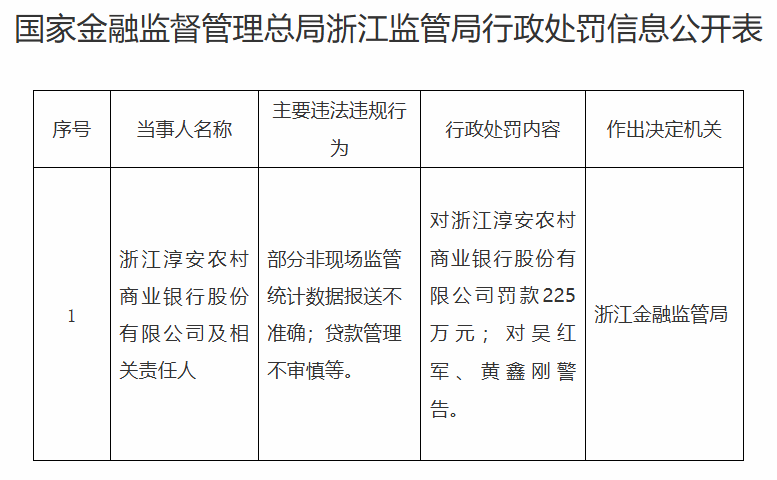 【大河财立方消息】2025年12月31日,国家金融监督管理总局浙江监管局披露的行政处罚信息公开表显示,因部分非现场监管统计数据报送不准确、贷款管理不审慎等,浙江淳安农村商业银行股份有限公司被罚225万元。