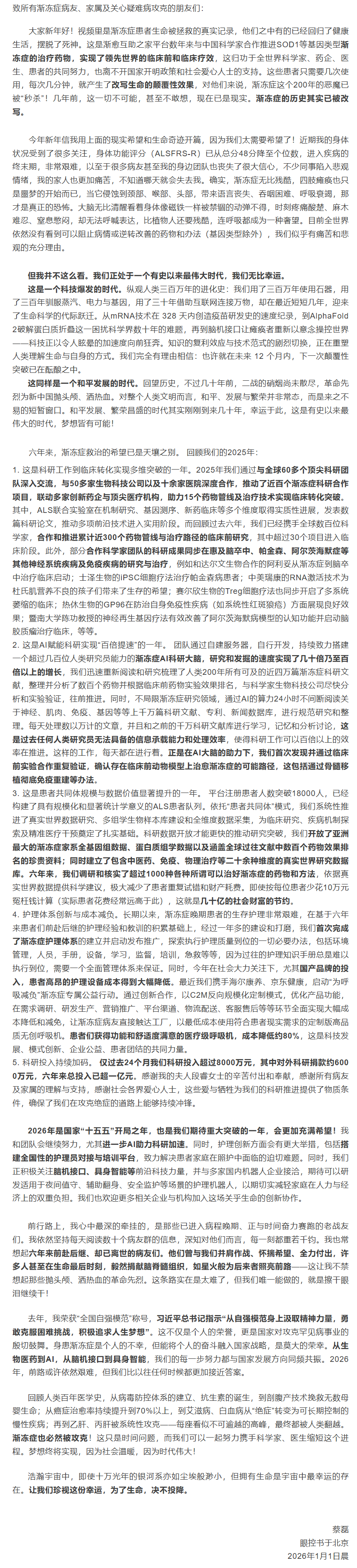 【大河财立方消息】1月1日,渐冻症患者、京东前副总裁蔡磊发布致所有渐冻症病友的公开信。