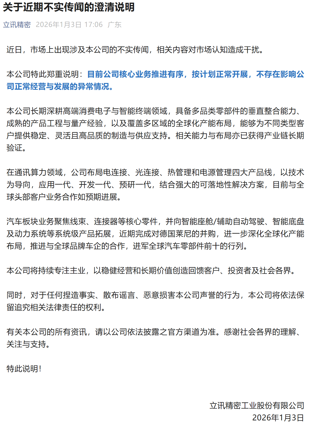 立讯精密表示,“近日,市场上出现涉及本公司的不实传闻,相关内容对市场认知造成干扰。”对此,立讯精密称,目前公司核心业务推进有序,按计划正常开展,不存在影响公司正常经营与发展的异常情况。
