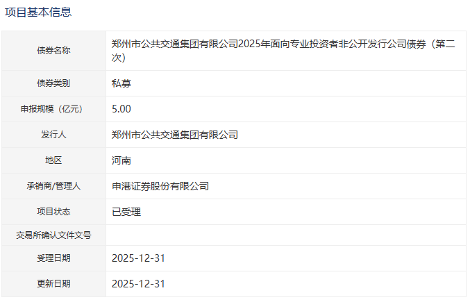 【大河财立方消息】1月4日消息,郑州市公共交通集团有限公司2025年面向专业投资者非公开发行公司债券(第二次)日前获深交所受理。