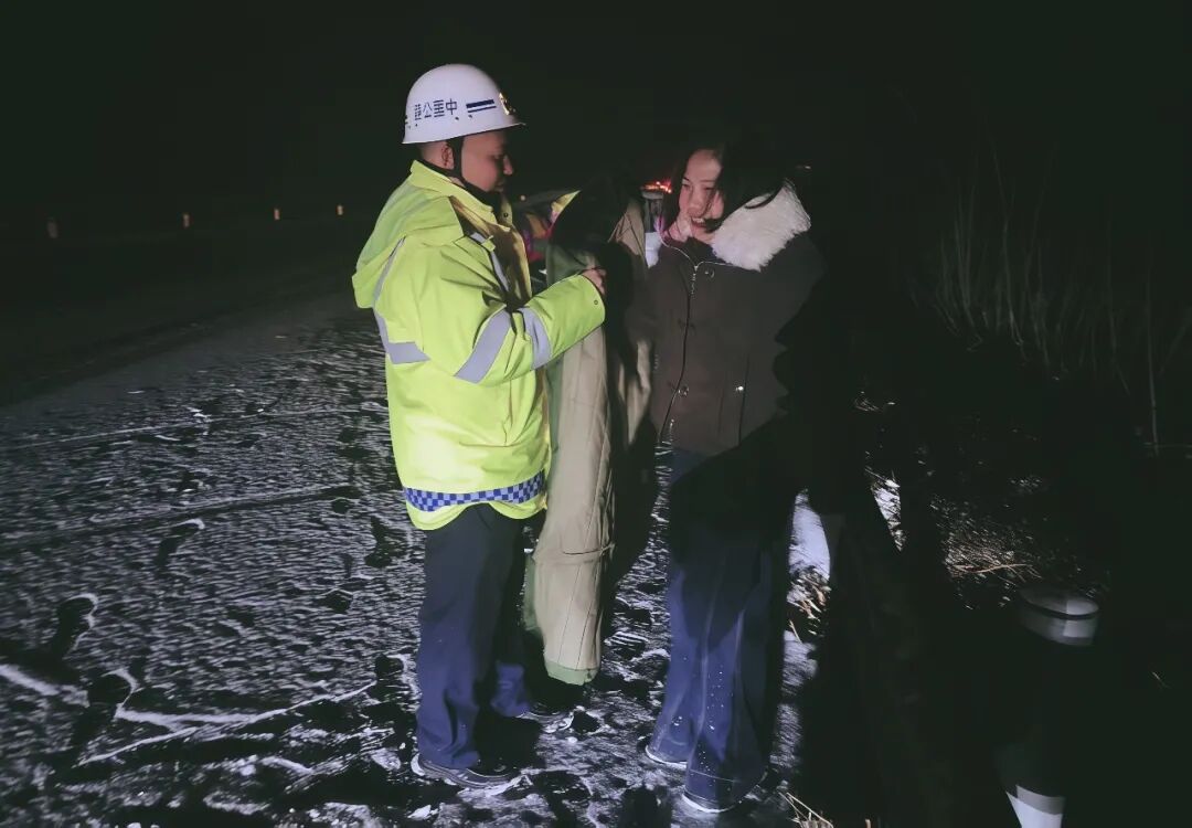 12月31日夜间,气温骤降,新密路产大队在巡逻途中发现一辆故障车辆。考虑到夜间寒风刺骨,队员们立刻为滞留的司乘贴心披上御寒棉大衣,一边保障现场安全,一边提供必要帮助,用坚守与温暖守护司乘的平安归途。