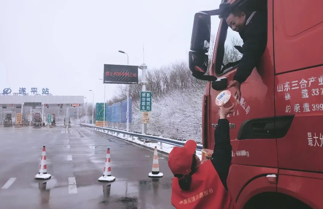 1月1日,冰雪天气给货车通行带来极大挑战,遂平收费站志愿者们迅速行动,在出口处为受困货车司机送上暖心食品。现场工作人员同步加强交通疏导,全力维护通行秩序,用贴心服务让司乘人员在凛冽寒冬中,真切感受到浓浓的关怀与出行便利。